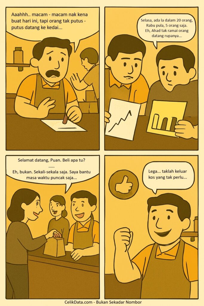 Encik Tanpa Nama ini juga tidak mahu stafnya duduk saja ketika tiada orang. Maka, dia pun mengkaji turun naik jualan kedainya.